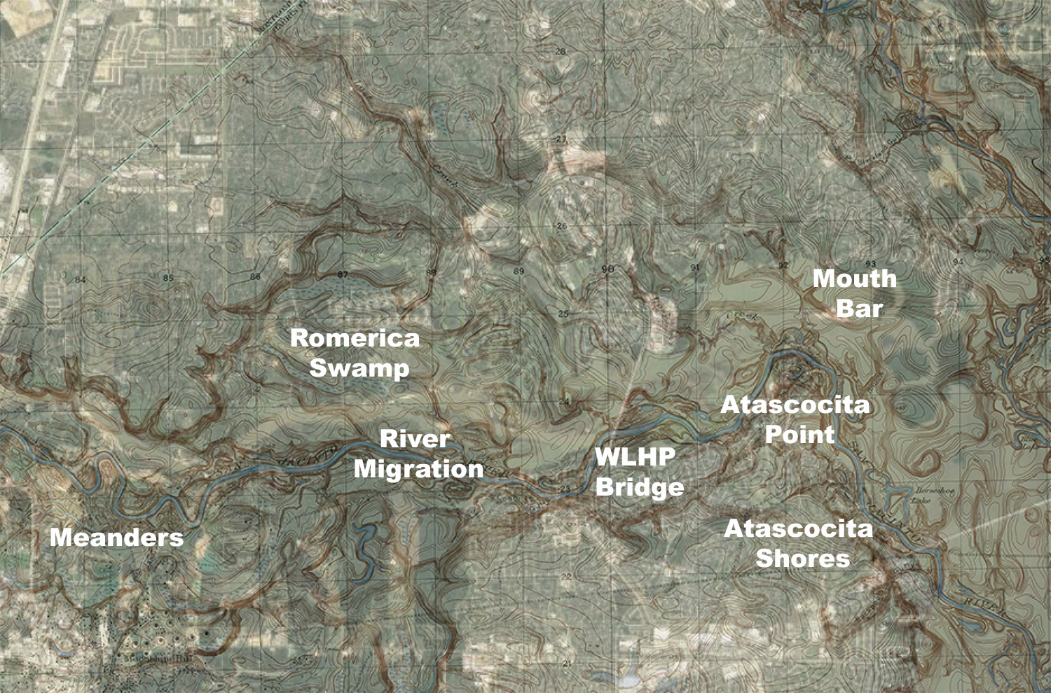 - In the 33/67 image, notice how Atascocita Point has grown past the relict channel.