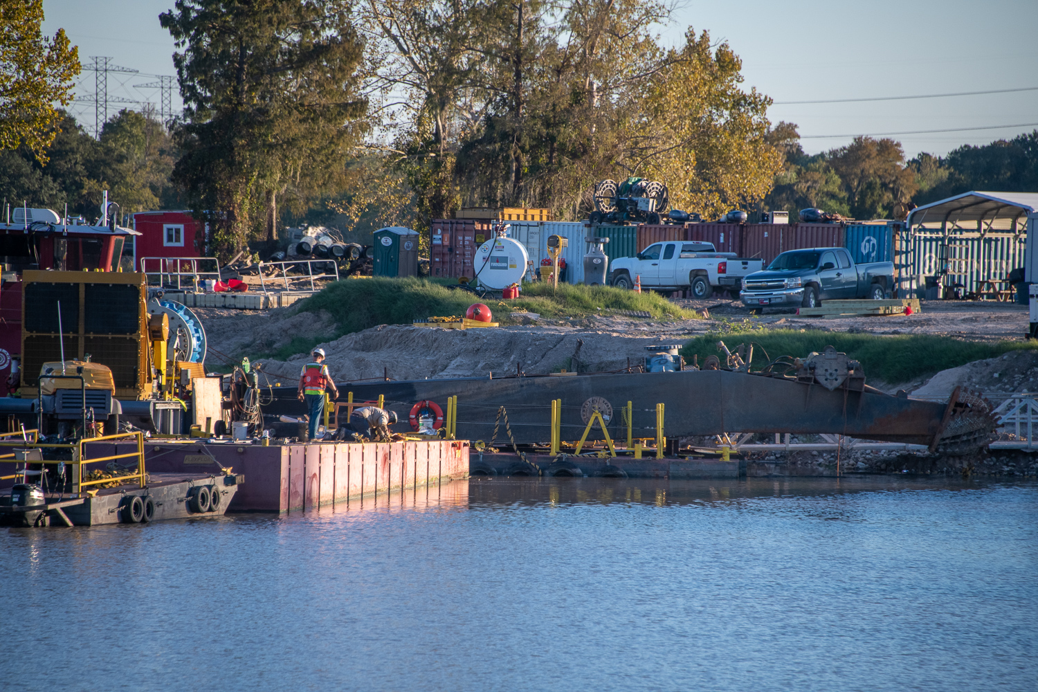 Great Lakes Dredge and Dock has finished its Army Corps assignment at the mouth bar. I photographed workers continuing to dismantle the company’s dredge this afternoon.