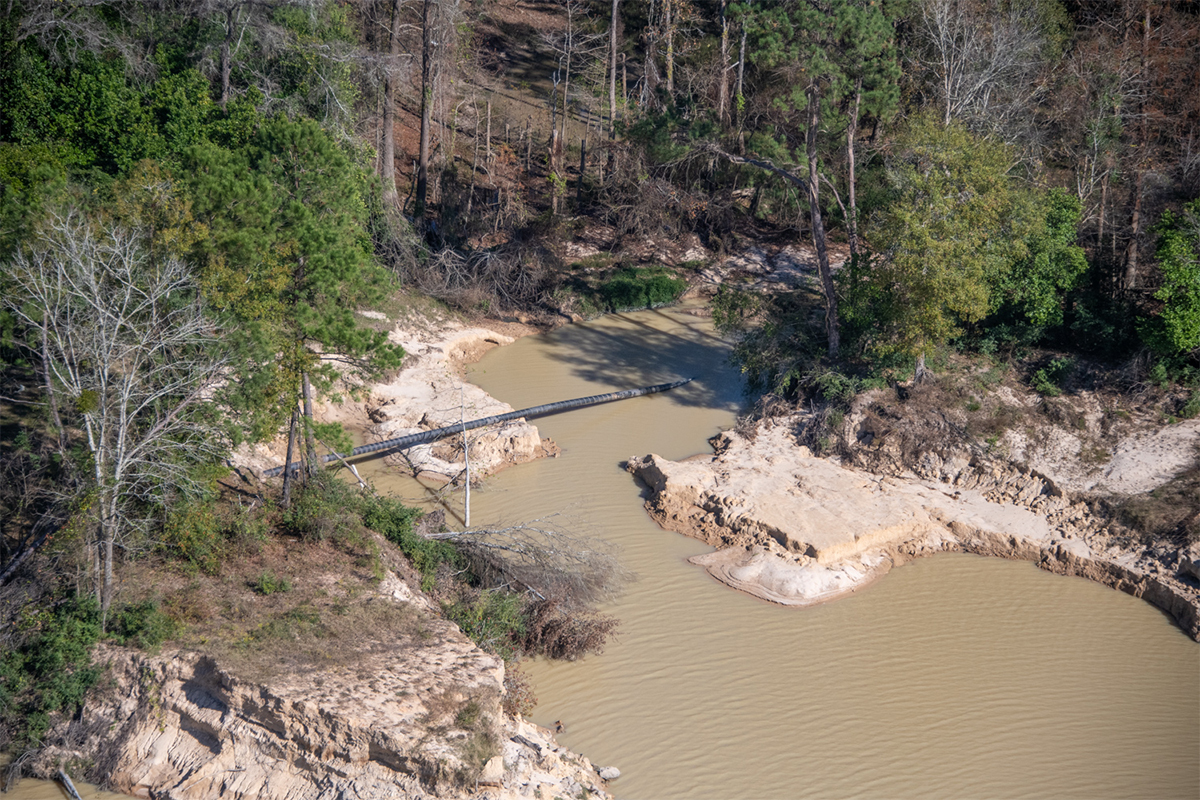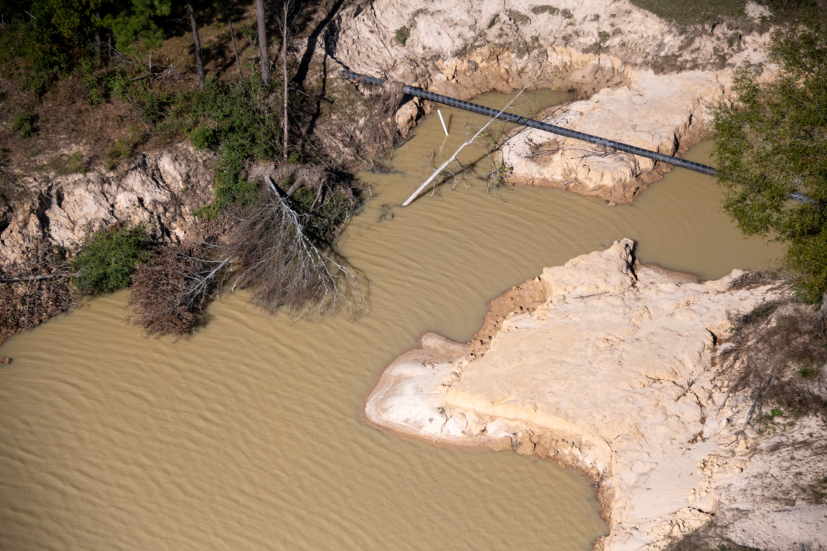 Flying over the trees, here’s what you see looking northwest. Notice the exposed pipeline in the bottom right of the photo. It aims toward a massive 183-foot breach in the mine’s northern dike created by Hurricane Harvey. Obviously, moving water exerts tremendous force in this area. See below.