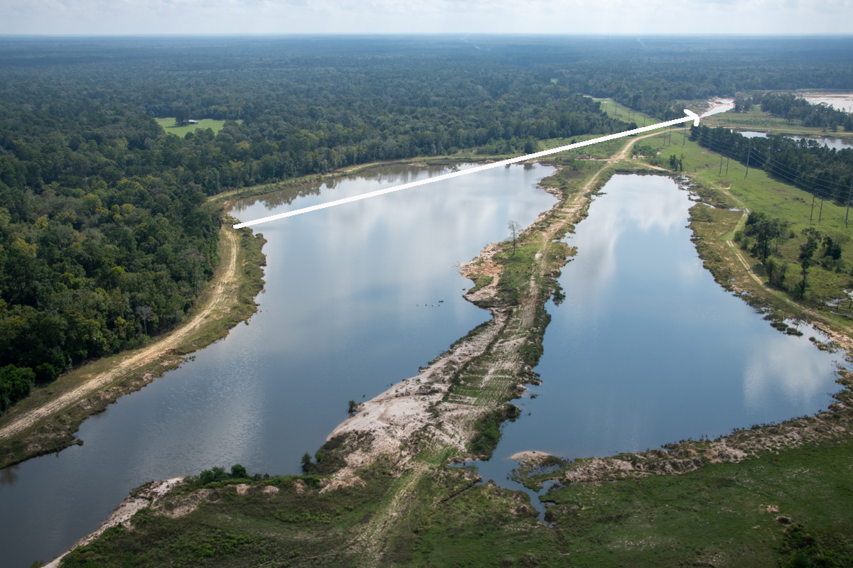 During Harvey, headward erosion took out about a 200-foot wide section of earth supporting the natural gas pipeline (also seen in the helicopter photo above). Harvey also elongated the lake in the middle of the pipeline corridors.