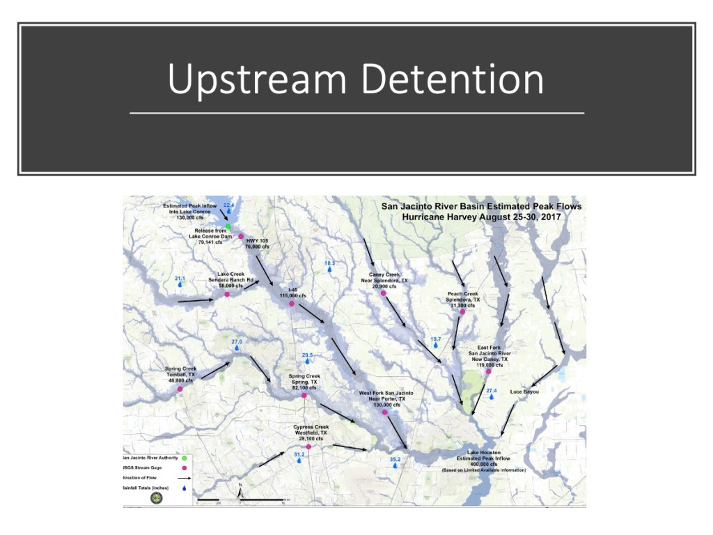 During Harvey, the release of 80,000 cubic feet per second from Lake Conroe added to downstream flooding. The goal: to find enough upstream detention capacity to help offset future releases. The San Jacinto River Basin Study will examine that possibility. It’s unlikely that one reservoir will provide enough capacity. However, multiple smaller reservoirs may.