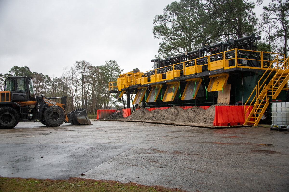 The giant dewatering plant operates much like shakers used in oil field drilling work. Water and sediment are pumped up from the lagoon by the dredge. They enter one side of the dewatering plant. There, they are pumped through centrifuges, then across a series of screens that vibrate. Water falls through the screens into a tank below. Sand accumulates on the screens until they dump it down chutes. From there, a front end loader scoops up the dirt and piles it up until trucks haul it away.