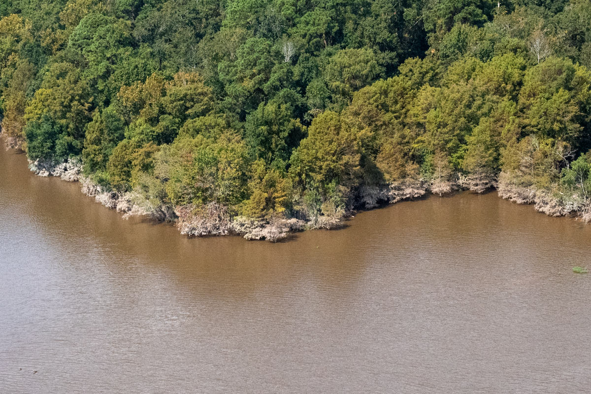 The mud on the vine is a much better high-water mark than the tree limb, though. During high water, the fast-moving water will cause partially submerged limbs to move up and down. Therefore, hydrologists would not use the limb to estimate high water.