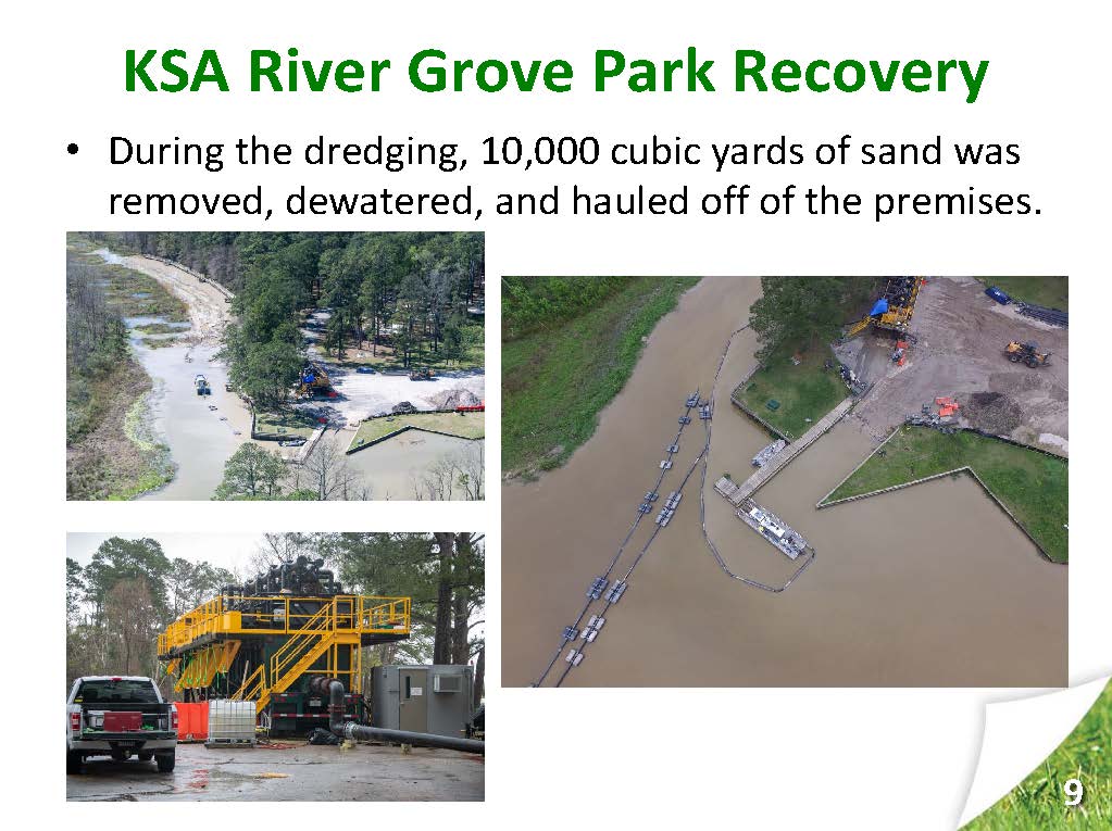 The final step of dredging the portion of the river along the park’s perimeter had to be put on hold until the US Army Corps of Engineers completed their project to dredge the San Jacinto River. The Corps removed the big sand bar formed during Harvey that was blocking access to the river from River Grove Park. This was a big help to KSA and very much appreciated.