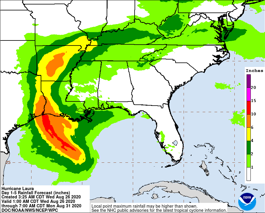 Laura will pass over warm Gulf waters today and upper air conditions that favor intensification through landfall. The National Hurricane Center forecasts a category 4, 130 mph hurricane at landfall.