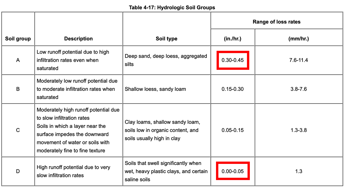 U.S. Department of Agriculture (USDA) classifies soil into four groups (A, B, C, D) that represent rates of rainwater infiltration. Group A has the highest rate of infiltration and D has the lowest. Think gravelly sand vs. clays.