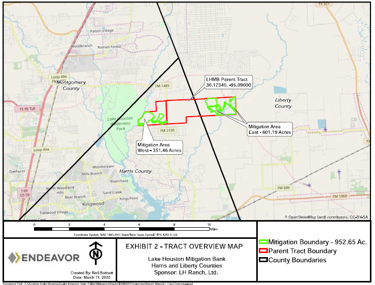 The applicant proposes the establishment and operation of western and eastern tracts within a larger parent tract of the Lake Houston Mitigation Bank (LHMB). The Western Tract is 351.46 acres. The Eastern Tract is 601.19 Acres. The combined tracts total 952.65 acres.