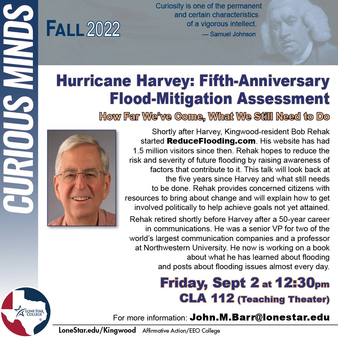 This Friday, September 2, 2022, I will give a talk at Lone Star College Kingwood. It will summarize what I have learned since Hurricane Harvey about flooding and flood mitigation while researching more than 2000 articles. The title of the talk: How Far We’ve Come, What We Still Need to Do. And it will focus on the Lake Houston Area plus areas immediately upstream in Harris, Montgomery and Liberty Counties.