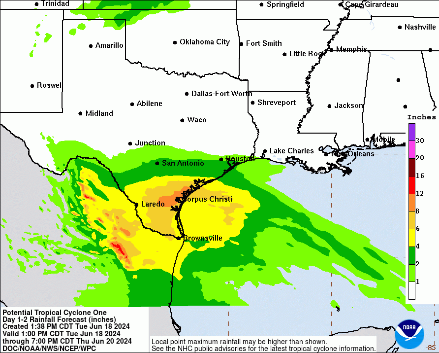 The National Weather Service (NWS) now predicts PTC1 will produce rainfall totals of 5 to 10 inches across northeast Mexico into South Texas. Maximum totals could approach 15 inches.