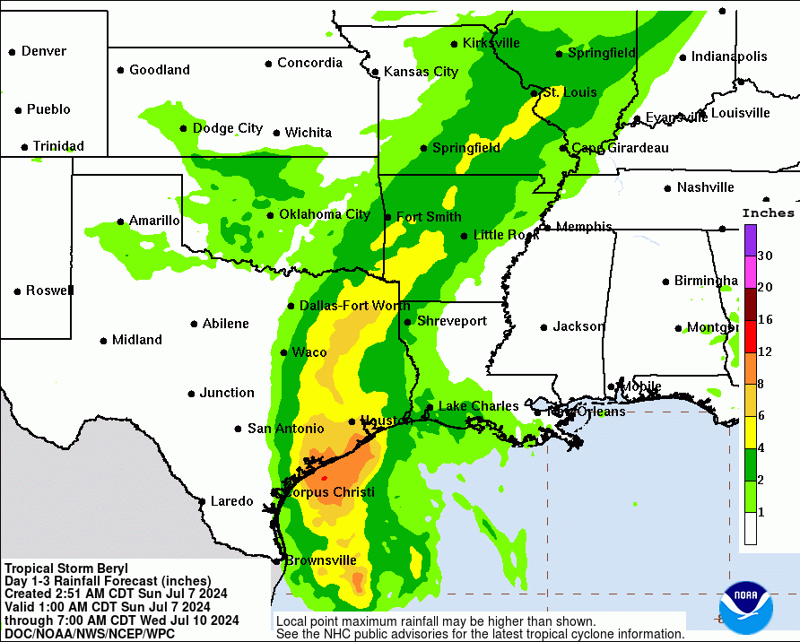 Widespread rainfall amounts of 5-10 inches are likely along and to the right of the track of Beryl, with isolated higher amounts under bands where training occurs. Banding may continue into Monday night and possibly Tuesday.