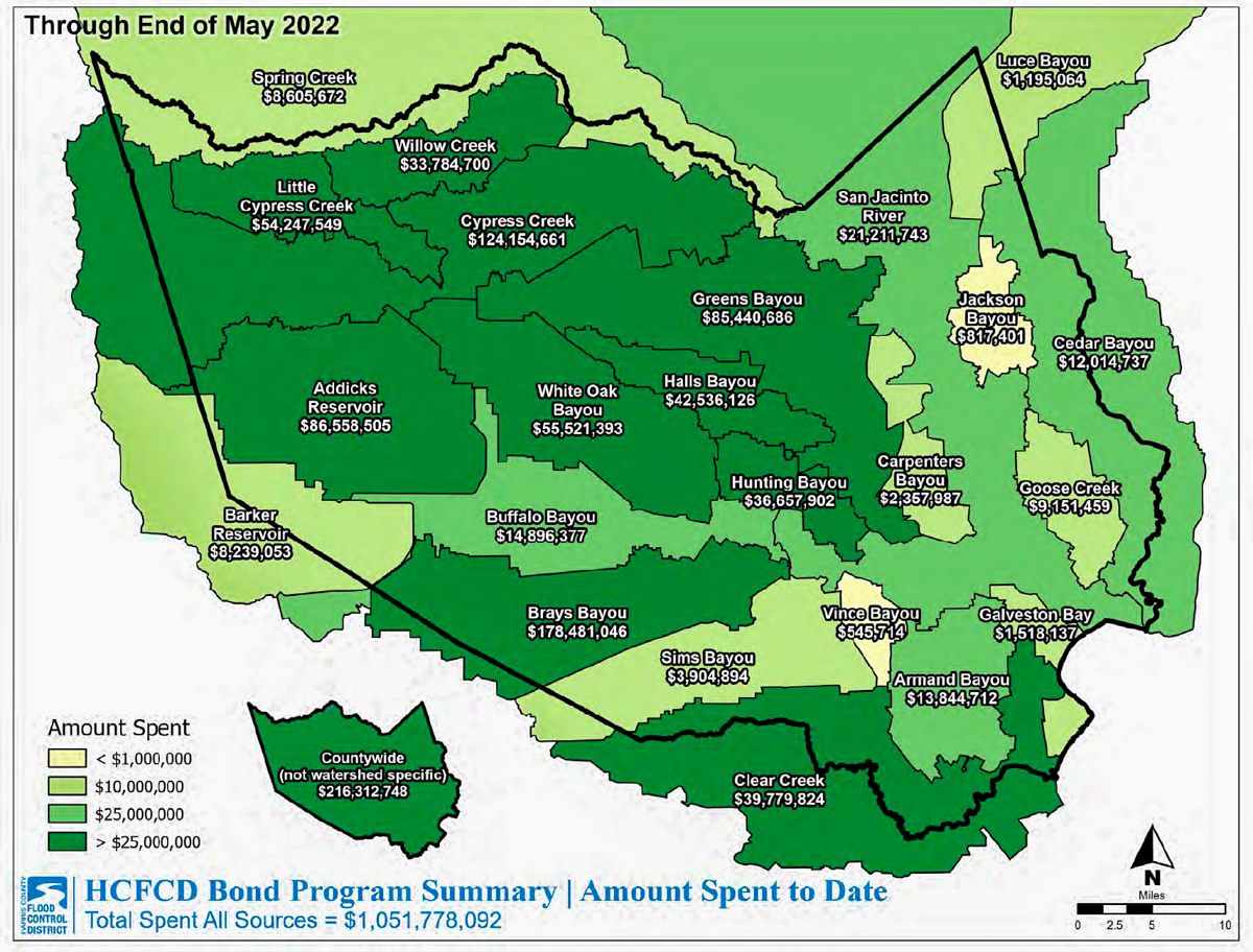 - In Harris County, we passed a $2.5 billion flood bond in 2018. Some estimated the real need at $60 billion. That’s why we spend so much time seeking matching funds at the federal level, such as the hundreds of millions of dollars that Rep. Dan Crenshaw helped secure for dredging.