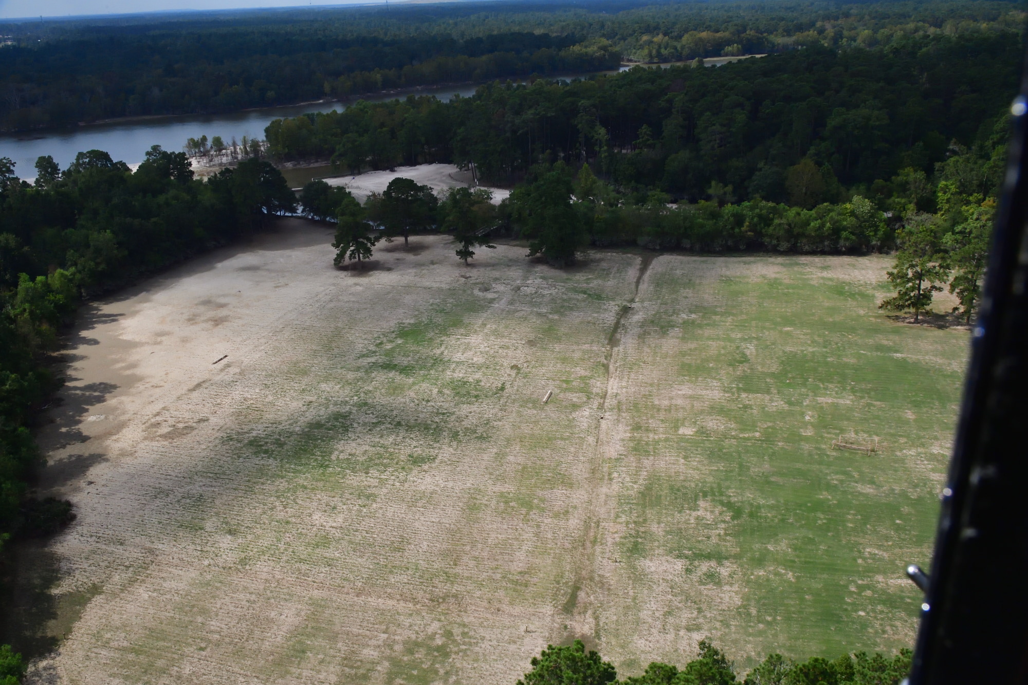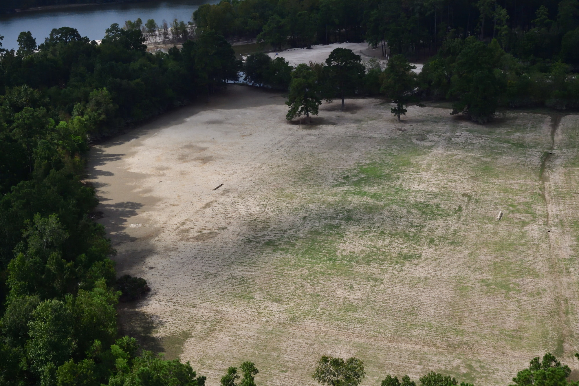 Looking west from the southeastern tip of Kingwood’s River Grover Park. Notice how the giant sand bar on the left, totally closes off the drainage ditch that cuts through the middle of the park. This dune is an estimated 15 feet high nearest the boat docks.